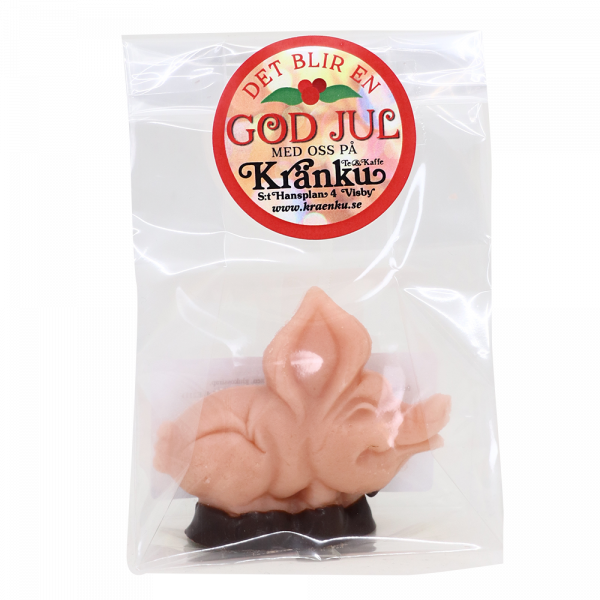 En glad gris av rosa marsipan. Foten är doppad i mörk choklad.
