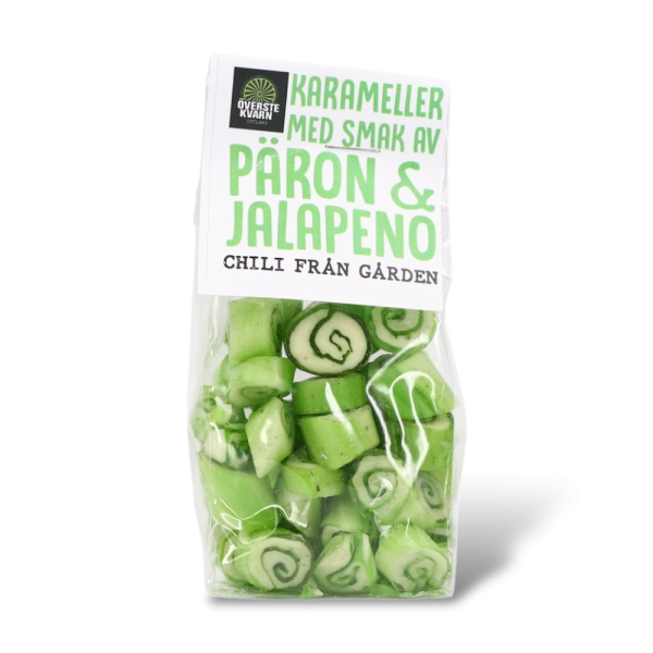 Heta karameller med smak av Päron och Jalapeño. Chilifrukten är egenodlad råvara hos Överstekvarn.
