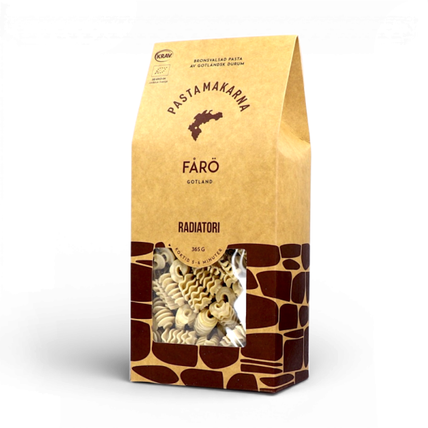 Pasta från Pastamakarna på Fårö, Gotland. Pastan görs av ekologiskt durumvete odlat på gotländska åkermarker som sedan mals och siktas i Roma på Gotland. Förpackning med 365 g pasta.