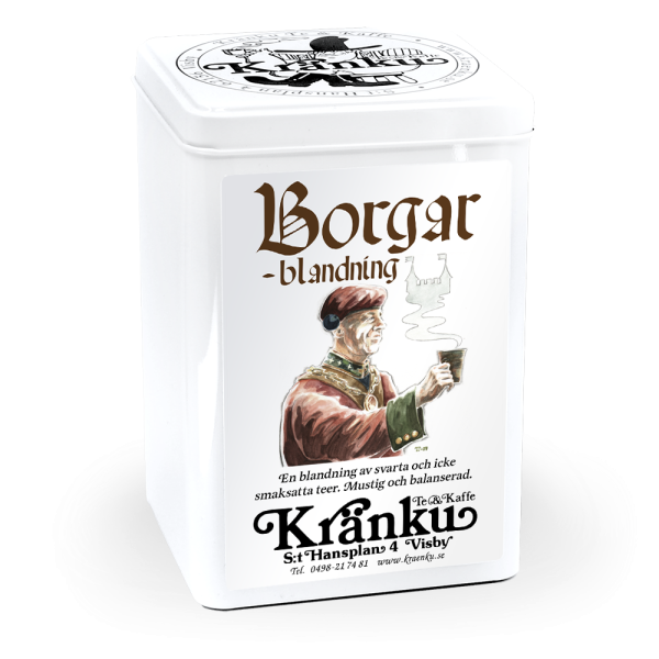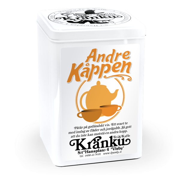 Välj vilken etikett du vill ha på burken i menyn. Finns inte teblandningen med i listan skriver du ditt önskemål som meddelande (vi skriver ej personliga hälsningar på etiketten, men gärna på ett vykort).